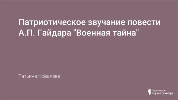 Урок литературы в 7-м классе знакомит учащихся с жизнью и творчеством А.П. Гайдара и его повестью «Военная тайна». Урок развивает речь учащихся, формирует навык работы с прочитанным текстом; воспитывает интерес к историческому прошлому нашей Родины, патриотизм, активную жизненную позицию.