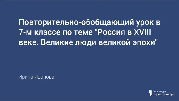 Восемнадцатый век в истории нашей страны – это удивительная и необычная эпоха. Большой интерес представляет личность Петра I и его неукротимая деятельность по реформированию всех сторон жизни общества. Военное искусство А.В. Суворова и его воля к победе и жизни – это всегда пример для подражания. Научная деятельность М.В. Ломоносова и его стремление к овладению научными знаниями вызывает восхищение и уважение. Это была великая эпоха, которую создали великие люди!