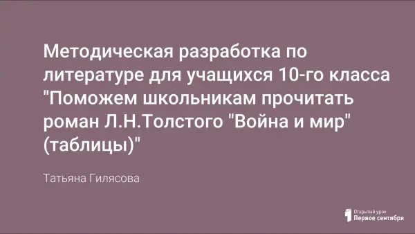 Прочитать и осмыслить роман Л.Н.Толстого «Война и мир» для десятиклассников не совсем просто из-за большого количества событий, персонажей. Читая роман, они пропускают очень важные для понимания многие эпизоды, не обращают внимание на детали. Таблицы помогут десятиклассникам обратить внимание на них, ориентироваться в сюжете романа-эпопеи. При завершении чтения каждого тома есть вывод.