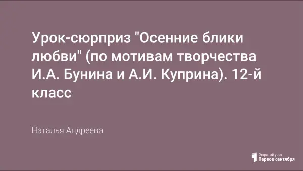 Идея урока заключается в том, чтобы ученики попробовали свои силы в написании стихотворений, сочинений-миниатюр, проявили определенные литературоведческие знания, могли самореализоваться. Каждому ученику на уроке предоставляется возможность заявить о себе, раскрыть определенные способности, тем самым укрепить свои позиции в школьной среде. Автор развивает творческие способности обучающихся на материале изученных художественных произведений И.А. Бунина и А.И. Куприна.