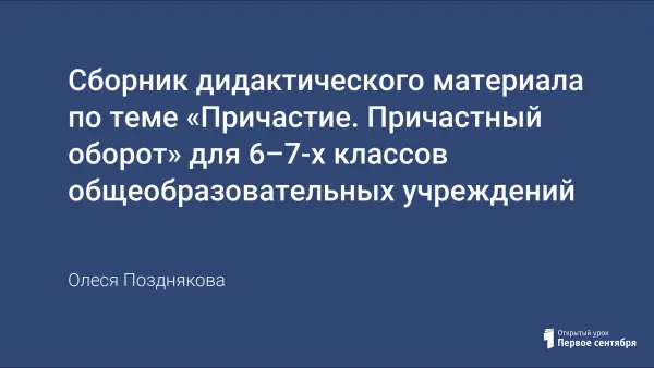 Весь представленный дидактический материал по теме «Причастие» представляет практическую ценность для учителей общеобразовательных школ и может использоваться на разных стадиях работы по данной теме: объяснение нового материала, закрепление изученного, систематизация и обобщение полученных знаний. Следует заметить, что содержание заданий носит не только тренировочный, но и развивающий характер. В них предусмотрены задания на развитие логики, мышления, обогащение словарного запаса, культуры речи, углубление знаний по предмету. Контрольная работа содержит 5 вариантов, состоящих из деформированного текста, каждый текст обеспечен рядом заданий.