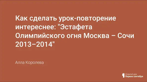 В статье рассматривается заключительный урок II четверти, который посвящен повторению пройденного материала и проводится в форме командной игры-эстафеты. Ученикам предлагается преодолеть путь, по которому проносили олимпийский огонь, решая примеры и задачи. Было условно выделено 12 этапов. Этапы имеют разную сложность, это отражается в заданиях и в оценивании результатов выполнения заданий. Занимательность игры придает эмоциональность монотонности повторения, помогает закрепить материал.