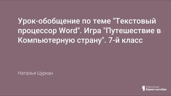 Урок обобщения и систематизации знаний. Это завершающий урок по теме, проверяются все знания учащихся, полученные на предыдущих уроках этой темы. Урок проходит в форме игры и каждый этап игры предполагает проверку качества знаний учащихся по текстовому процессору, при этом активизируются знания прошлых тем (устройство компьютера, история создания вычислительной техники).