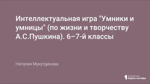 Методическая разработка интеллектуальной игры для учащихся 6–7-х классов «Умники и умницы» нацелена на развитие познавательного интереса учащихся к жизни и творчеству А.С. Пушкина и может быть использована учителями-словесниками не только как готовый сценарий для внеклассной работы, но и как источник информации для создания собственных методических материалов.