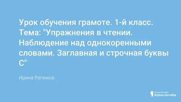 Дети знакомятся с заглавной буквой С, продолжают наблюдение за однокоренными словами, отрабатывают навыки самооценки. Чтение на уроке строится от простого к сложному (слоги, слова, предложения, текст). Дети в классе с разным уровнем чтения, поэтому используется дифференцированный подход (дополнительные карточки для хорошо читающих). Обратная связь на уроке осуществляется с помощью сигнальных карточек.
