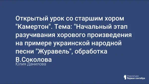 Цель урока – разучить I-ю часть украинской народной песни «Журавель» в обработке В.Соколова. В ходе урока закрепляются знания учащихся о соблюдении правил пения в хоре, охране здоровья, сохранения голоса; дети овладевают вокально-певческими навыками: чистого интонирования, певческой дикции, артикуляции и дыхания. Урок развивавает интерес учащихся к хоровому пению, гармонический слух, чувство ритма, строя, ансамбля.