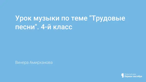 Учитель рассказывает учащимся об истории появления трудовых песен, значении ритма в организации трудовых действий. Раскрытие темы урока продолжается путем сравнения произведений художников, поэтов, композиторов, посвященных тяжелому труду бурлаков, радостному труду людей и сравнение башкирского танца, изображающий трудовые действия.