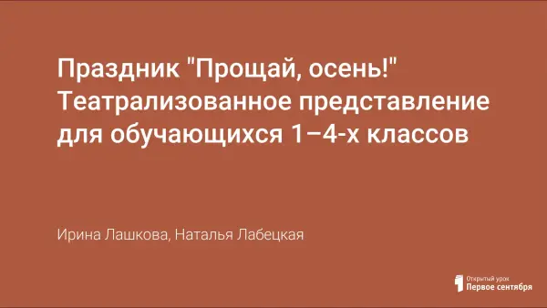 Театрализованное представление для обучающихся 1–4-х классов. Цель праздника - активизация знаний об осени у детей данного возраста, развитие у учащихся творческих способностей, речи, взаимовыручки, толерантности и любви к природе.