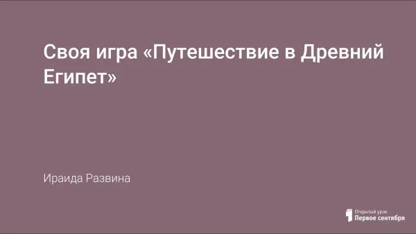 Презентация была выполнена в виде известной интеллектуальной игры «Своя игра». Задания поделены на 8 категорий: фараоны, письменность, Нил, животные, боги, природа, военное дело, культура. В каждой категории по пять вопросов, от пяти до двадцати пяти баллов. Ведет та команда, которая успевает ответить первой. В игре есть музыкальные паузы, т. к. команда имеет право на отдых и сохранение хода в игре. По итогам подсчета голосов выигрывает команда, набравшая наибольшее количество баллов.