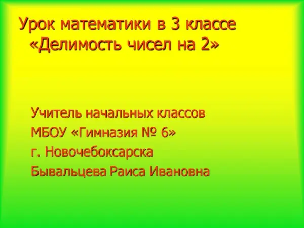 Урок может быть предложен в классе развивающего обучения по системе Эльконина-Давыдова, а также по общеобразовательной программе для расширения знаний по математике в теме «Деление многозначных чисел на однозначное число». Ученики знакомятся с признаком делимости чисел на 2. В ходе урока формируются навыки устных и письменных вычислений, отрабатываются навыки работы в группах, развивается логическое мышление, умение обобщать, делать выводы.