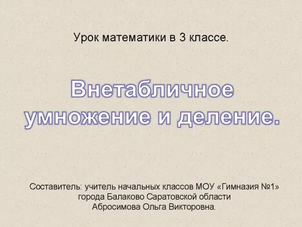Урок в 3-м классе призван совершенствовать навыки внетабличного умножения и деления, развивать память, логическое мышление, наблюдательность, математическую речь, воспитывать самостоятельность, трудолюбие.