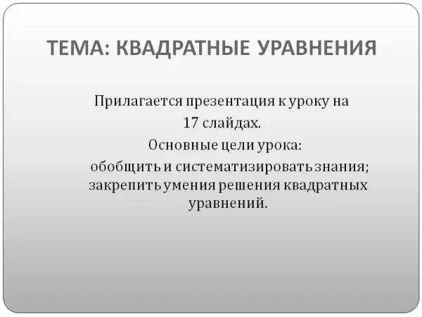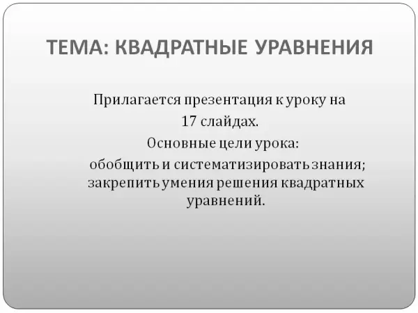 Презентация в работе – опорный конспект. План урока вынесен на каждый слайд. Предложены слайды с заданиями к уроку-обобщению по теме "Квадратные уравнения". Использован дифференцированный подход к учащимся.