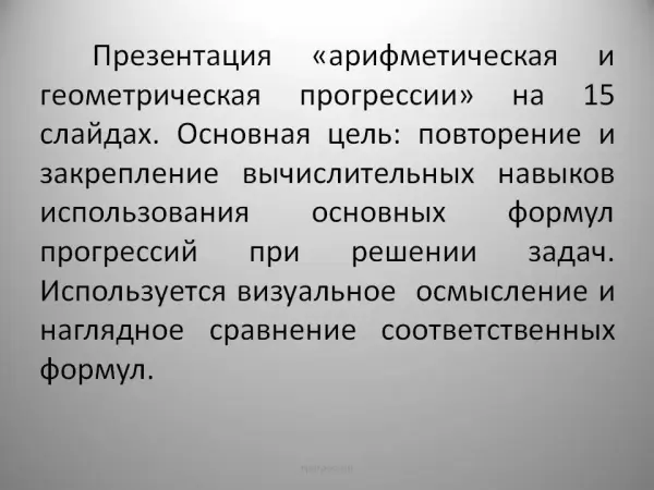 Урок обобщения и систематизации материала является последним перед контрольной работой по теме «арифметическая и геометрическая прогрессии». При помощи презентации происходит визуальное осмысление и наглядное сравнение. На слайдах презентации изображаются соответственные формулы одновременно двух прогрессий. На уроке идет погружение в активную глубокую, умственную деятельность по решению задач. Представлена дидактика из материалов ГИА.