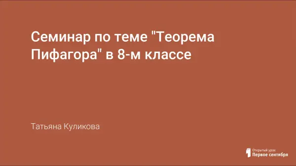 Цель семинара: обобщить разные способы доказательства теоремы Пифагора, закрепить навык их применения. Ученики путешествуют по стране Пифагория: делают сообщения о Пифагоре, о Пифагоровых тройках, представляют способы доказательства и проекты по изготовлению египетских треугольников, выполняют практические задания: доказывают тезисы, содержащиеся в «Сутрах», решают задачи по готовому чертежу и на нахождение неизвестных элементов треугольника. Проводится рефлексия и выясняется значение теоремы.