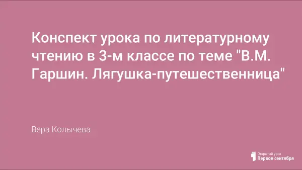 Данный урок был разработан в ходе изучения курса лекций В.А. Лазаревой «Уроки литературного чтения в современной начальной школе» в соответствии с происходящими изменениями в современной системе образования. Цель урока: познакомить учащихся с произведением В.М. Гаршина. Задачами данного урока являются: знакомство учащихся с новой литературной сказкой и биографией писателя; развитие речи и умения работать с текстом; формирование системы читательских умений.