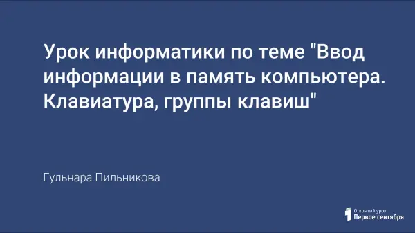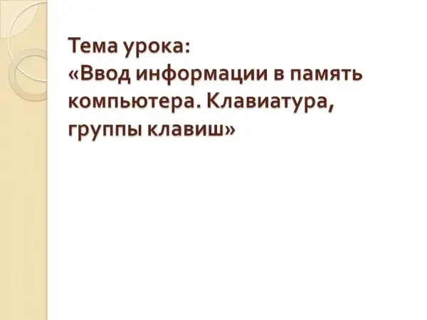 Урок изучает новый материал об основных устройствах компьютера, о способе ввода информации в память компьютера на клавиатуре, знакомятся с группами клавиш и их назначением и закрепляют полученные знания практической работой на компьютере.
