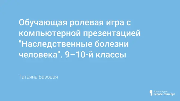 "Наследственные заболевания человека" – одна из учебных тем, вызывающих неподдельный интерес учащихся. Ученики интересуются: "Как и почему это происходит? Со временем я стану родителем, что нужно сделать, чтобы избежать или смягчить проявление наследственных заболеваний?..". Все перечисленное учитывает и решает внеклассное мероприятие по биологии – обучающая ролевая игра "Наследственные заболевания человека" с компьютерной презентацией.