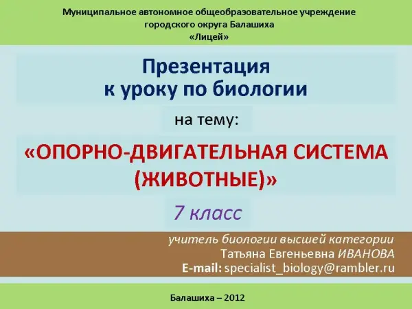 На уроке применяются карточки, слайды презентации. Цель занятия: познакомить учащихся со строением и функциями опорно-двигательной системы у разных групп животных, направлением эволюции опорно-двигательной системы, привить чувство ответственности человека за живые организмы, обитающие в природе; изучить опорно-двигательную систему одноклеточных организмов, системой многоклеточных организмов (рыб, земноводных, пресмыкающихся, птиц и млекопитающих); сформировать представление об эволюции опорно-двигательной системы; усвоить основные понятия (наружный и внутренний скелет) и материал о характерных особенностях строения скелетов животных; формировать у учащихся умения работать с дополнительной литературой; развить познавательный интерес учащихся к окружающей природной среде.