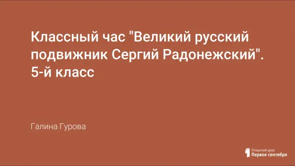 Цель классного часа: знакомство учащихся с православными подвижниками земли Русской. Мероприятие проводится в форме устного журнала, дети знакомятся с жизнеописанием Святого Сергия Радонежского. Характеризуют причины выбора Сергием затворнической жизни. Дают описание его христианских подвигов. Получают образец кроткого и смиренного поведения, терпения и любви к ближнему. Учащиеся имеют возможность участвовать в качестве содокладчиков, проявлять творческие способности.