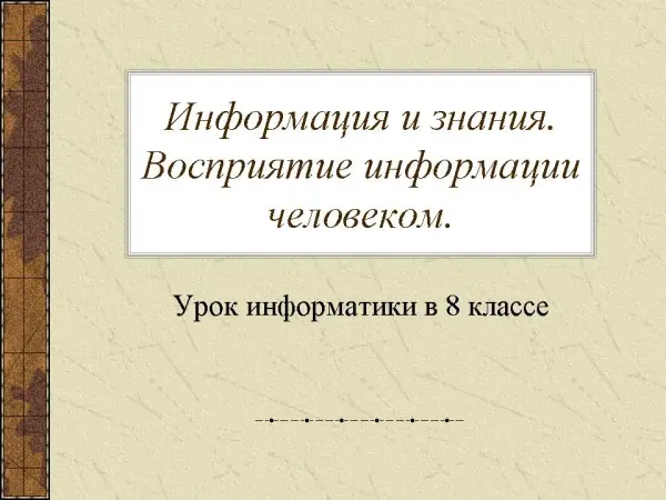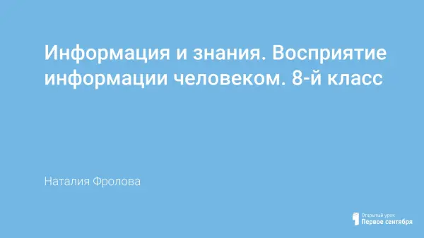 Представлен урок-открытие новых знаний, знакомит с фундаментальным для информатики понятием «информация». Традиционное представление информации (знания, которые человек воспринимает из окружающего мира при помощи органов чувств), различная классификация знаний с примерами, формы восприятия и представления информации (образная и знаковая), формальные и естественные языки.