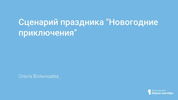 Сценарий праздника «Новогодние приключения» состоит из двух частей. Первая часть – встреча со стариком Хоттабычем, который пытается помочь детям вызвать Деда Мороза с помощью своей волшебной бороды, но, так как он никогда его не видел, появляются различные персонажи сказок: Карабас Барабас, Карлсон и Снеговик. Вторая часть это соревнование Деда Мороза и Хоттабыча в силе волшебства.