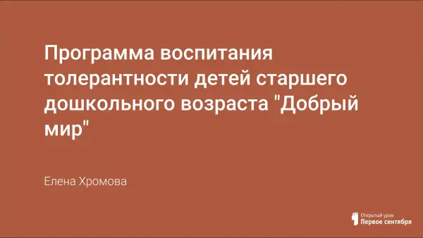 Программа нацеливает на последовательность введения ребенка в мир доброжелательных отношений. Цель – помочь ребенку дошкольного возраста осмыслить основные ценности и смыслы жизни в мире с другими людьми. Разработанная программа включает три больших раздела. В содержание программы воспитания толерантности включен блок работы с родителями – «Мой дом».