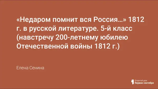 Данный урок создает условия для формирования представления обучающихся об Отечественной войне 1812 года; показывает общую картину Отечественной войны, Бородинского сражения, ярких полководцев, героические личности (Наполеон, М.И. Кутузов, Д.Давыдов); выясняет, в каких произведениях русской литературы отразилась тема Отечественной войны 1812 года.