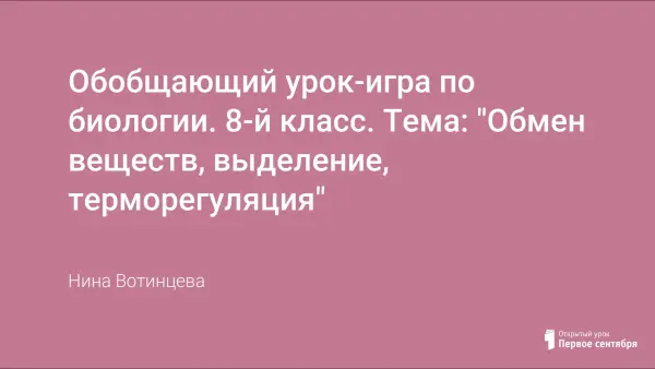 Обобщающий урок-игра для 8-го класса проводится в занимательной форме смотра знаний с целью углубить и закрепить знания учащихся по биологии по темам "Обмен веществ", "Выделение", "Терморегуляция". Через занимательные задания развивается биологическое мышление, устная речь, способность применять имеющиеся знания при поиске решения проблемных ситуаций.