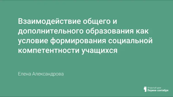 Социальная компетентность учащихся формируется школьными предметами, внеклассной работой, дополнительным образованием и, не в последнюю очередь, повседневным личным опытом учащихся. Для успешного достижения этой образовательной цели необходимо проектирование единого культурно-образовательного пространства взаимодействия общего и дополнительного образования. При этом в проектной области следует интегрально представить существенные характеристики и параметры как социума, развивающего эту компетентность, так и образовательной системы, её формирующей.