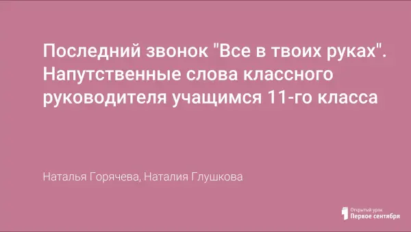 «Последний звонок» – символ окончания учебы, веселый и грустный праздник одновременно. Как лента кино, заканчиваются беззаботные школьные годы, подарившие вам много хорошего, сделавшие вас умнее, дружнее, подготовившие вас к взрослой жизни, жизни, полной новых забот и приключений, возможностей, способных привести вас к своей мечте.