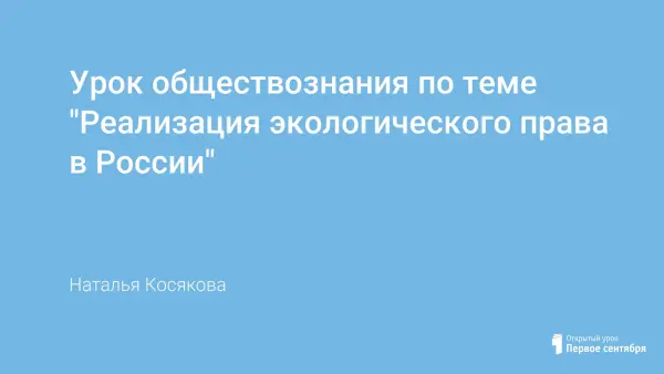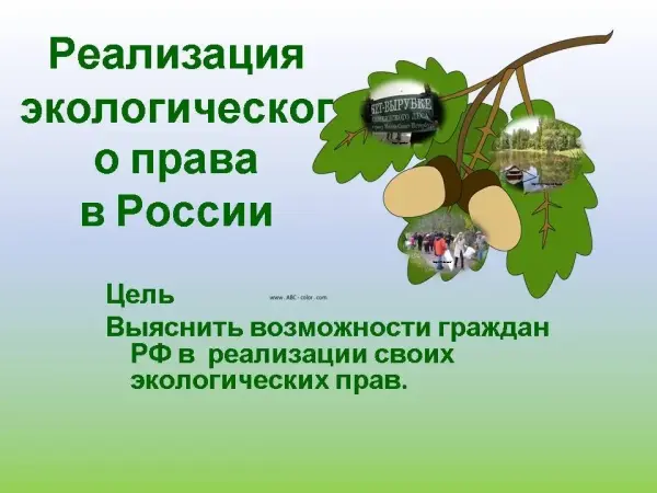Презентация закрепляет знания в 10–11-х классах, составлена с учетом самостоятельной работы учеников. Учащиеся, работая с презентацией, смогут закрепить знания по теме «Реализация права» на примере экологического права.