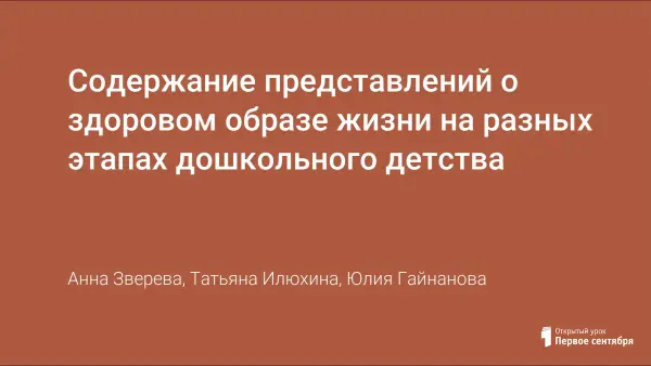 Авторами затрагивается значимая проблема формирования ценностей здорового образа жизни, представлений о нем на разных этапах дошкольного детства. Приводятся важные положения нормативной документации в этом направлении. Раскрывается понятие «здоровый образ жизни», «здоровье», компоненты культуры здоровья. Приводятся иллюстрации представлений о здоровье у детей дошкольного возраста. Представлено покомпонентное содержание представлений о ЗОЖ у детей дошкольного возраста. Актуализируется значимость объединения усилий педагогов и родителей в формировании культуры здоровья детей дошкольного возраста.