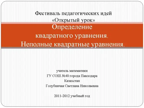 Представленный материал в интерактивной наглядной форме способствует повышению мотивации к обучению, более эффективному пониманию изучаемого материала, делает урок более интересным и запоминающимся. Показаны некоторые возможности применения интерактивной доски на каждом этапе урока. Наглядные методы и задания позволяют осуществлять двустороннюю связь, создать условия для усвоения учащимися понятия квадратного уравнения и приобретения практических приемов решения неполных квадратных уравнений.