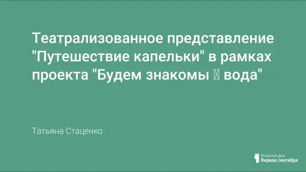 Данное театрализованное представление является частью проекта «Будем знакомы, вода!» (средний, старший возраст). Цель: формирование личностно-значимого отношения к природе и ее водным ресурсам, чувства сопричастности к родному краю, природному наследию своего народа. Для представления родителями были изготовлены атрибуты – шляпы из бросового и природного материала. В театрализации родители исполняли роли Облака, Дождя, Реки, Солнца, Земли.