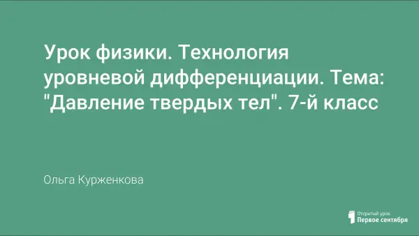Цель: изучить физическую величину «давление» на опору, единицы его измерения, научить решать задачи. Класс делится на 3 группы: 1-я группа – дети с ОВЗ (VII вид); 2-я группа – учащиеся с умениями базового уровня; 3-я группа – учащиеся надбазового (продвинутого) уровня. Учебные задачи в начале урока формулируются для каждой группы дифференцированно.