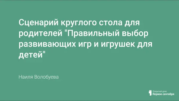 В статье представлен сценарий круглого стола для родителей. Цель мероприятия – вооружить родителей знаниями о безопасном и целесообразном подборе игрушек и развивающих игр для детей дошкольного возраста.