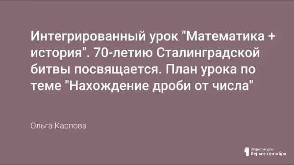Интегрированный урок разработан для учащихся 6-го класса, а также может использоваться с целью повторения темы в 7‒9-х классах, закрепления нахождения дроби от числа при решении задач на историческом материале. Цель урока: сохранение памяти, воспитание патриотизма, гордости за одержанную победу в Сталинградской битве, изменившую весь ход в Великой Отечественной войне.