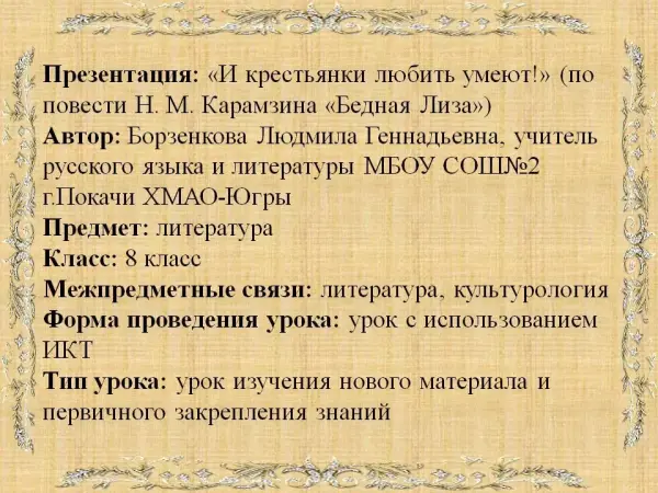 Урок литературы с ИКТ по повести Н.М. Карамзина «Бедная Лиза» изучает новый материал и первично закрепляет знания. Используются межпредметные связи литературы и культурологии. На протяжении урока демонстрируется презентация.