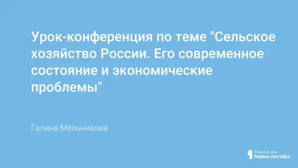 Урок-конференция в 9-м классе поможет учителю и ученику лучше рассмотреть вопросы по теме: "Сельскохозяйственное производство России". Урок-конференция рассматривает основные отрасли сельско-хозяйственного производства, а именно растениеводство и животноводство, которые обеспечивают население продуктами питания, а промышленность сырьем. Кроме того, рассматриваются проблемы сельского хозяйства в России.