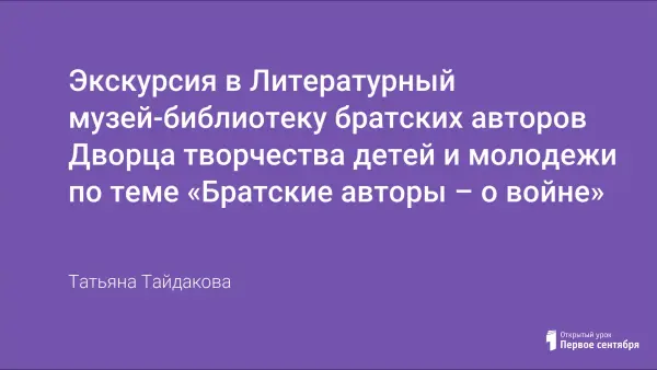 Литературный музей-библиотека братских авторов – это уникальный музей, где хранится более 1600 экспонатов: книги с автографами, фотографии, воспоминания, документы наших земляков. Литературный музей – это то место, где можно побыть наедине с книгами, почитать их и полистать. Здесь можно встретиться с авторами, послушать их и задать вопросы, получить автограф. Литературный музей – это то место, где проходят экскурсии – «Братские авторы - детям», «Жил в Сибири поэт», «Детских душ искатель». Но особое место в нашем музее занимает экскурсия – «Братские авторы о войне».