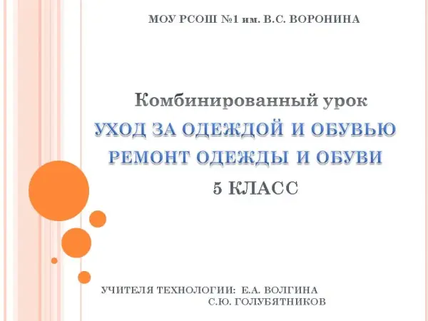 Урок информирует учащихся о способах ремонта и ухода за одеждой и обувью, прививает навыки личной гигиены, аккуратность и бережливость, воспитывает эстетический вкус. Дает представление о ремонте одежды подкладной заплатой, символах по уходу за одеждой из хлопчатобумажных и льняных тканей, видах клея и применении их при ремонте кожаной обуви.