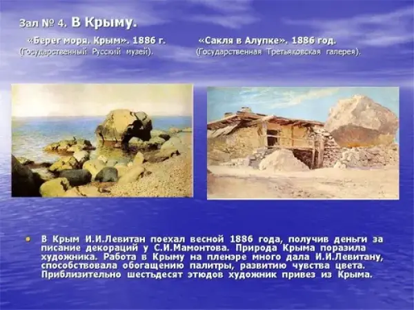 Данная авторская работа представляет собой урок для студентов среднего профессионального образования по дисциплине «История изобразительного искусства». Занятие проходит в форме путешествия учащихся по залам виртуального музея. Это экскурсия по двенадцати залам (12 презентаций), наглядно освещающим основные аспекты творчества выдающегося русского художника И.И. Левитана.