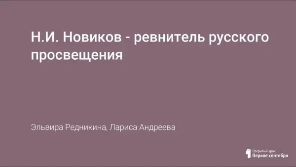Презентация посвящена одной из крупнейших фигур русского просвещения Н.И. Новикову. Она расширяет кругозор учащихся, способствует формированию чувства любви к Родине, к ее людям и историческому прошлому родной земли. Материал урока рекомендуется для учащихся 7–8-х классов.