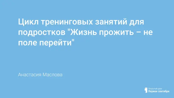 Цикл тренинговых занятий для работы с подростками 14–16 лет и рассчитан на 8 занятий, продолжительностью от 60 до 90 минут. Количество участников – от 8 до 14 человек. Каждое занятие включает в себя приветствие, основную часть, рефлексию после каждого упражнения, ритуал прощания. На занятиях используются методические средства такие, как беседа, дискуссии, самотестирование, различные варианты психотехнических игр и упражнений, самовыражение в рисунках.