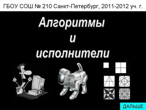 Урок сопровождается презентацией, при помощи которой учащиеся могут самостоятельно изучить тему «Алгоритмы и исполнители». Его можно рассматривать как элемент дистанционного обучения.