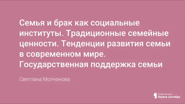 На занятии дается понятие об основных этапах становления семейно-брачных отношений, анализируются современная семья и тенденции ее развития; воспитывается чувство ответственности перед семьей и правильные взаимоотношения.