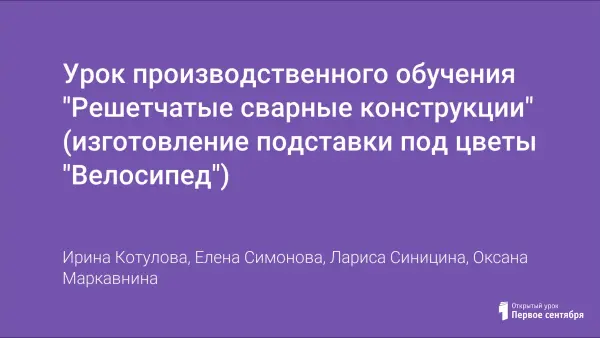 Подробно описаны элементы и этапы урока, рассчитан хронометраж, указано необходимое оборудование и инструменты, заготовки, материалы. Согласно приведенной технологической карте (с рисунками, чертежами и фотографией изделия-эталона), предусмотрено "пошаговое" выполнение сварной конструкции ландшафтного дизайна "Велосипед".