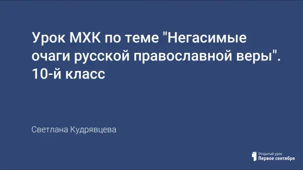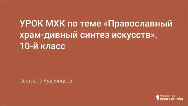 Урок МХК знакомит с внешним и внутренним строением православного храма: частями храмового помещения, с историей русского иконостаса, предметами специального назначения и их названиями. Цель урока: уяснить принципы синтеза и взаимодействия искусств; воспитывать доброту, милосердие, терпимость, бережное отношение к историческому и культурному наследию своего народа.