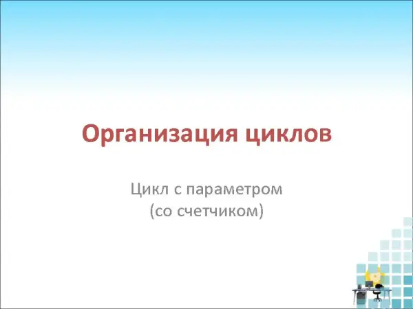 Урок разработан для учащихся 9-х классов. Дается определение цикла, рассматриваются виды циклических алгоритмов, изучается способ организации цикла с параметром (на QBasic) и условия его работы. Объяснение материала сопровождается презентацией, которая визуализирует процесс выполнения циклического алгоритма. В конце урока предлагаются простые программы на QBasic, прослеживается ход программы с заполнением таблицы значений переменных.