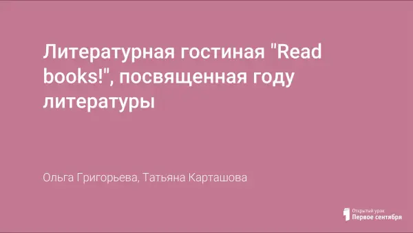 Литературная гостиная является внеклассным мероприятием, посвященным году литературы для учащихся 8–10-х классов, проведенным в форме заседания литературного клуба. Данное мероприятие направлено на приобщение учащихся к пониманию творчества классиков английской и американской литературы и предполагает создание языковой среды и формирование положительной мотивации для роста творческого потенциала учащихся и стимулирования их речевой деятельности.